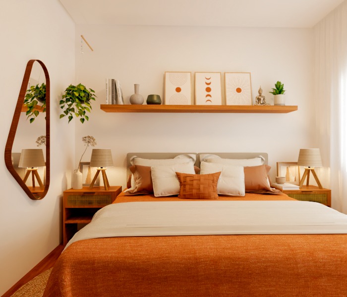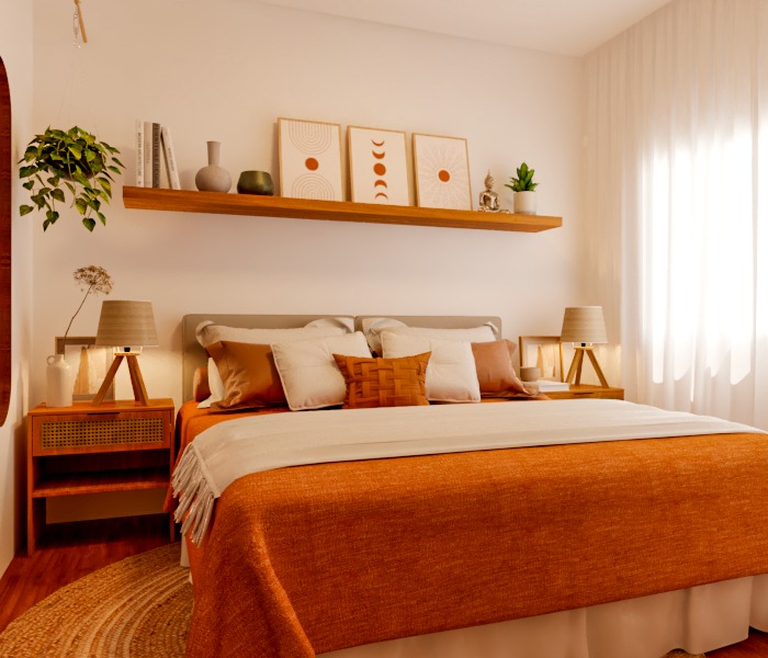 Este projeto, inspirado no estilo Boho Chic, foi desenvolvido para criar um quarto confortável e acolhedor, sem grandes mudanças estruturais. O ambiente destaca-se pelo uso de elementos naturais, como madeira, tapete de fibra natural e linho, além da presença de vegetação, que proporciona aconchego. O estilo Boho Chic é caracterizado pela mistura de texturas e cores variadas, combinando tons vivos com neutros. Elementos como bambu, palha e madeira, complementados por macramê, foram escolhidos para acentuar a essência do Boho Chic e garantir um espaço harmonioso e estilizado.