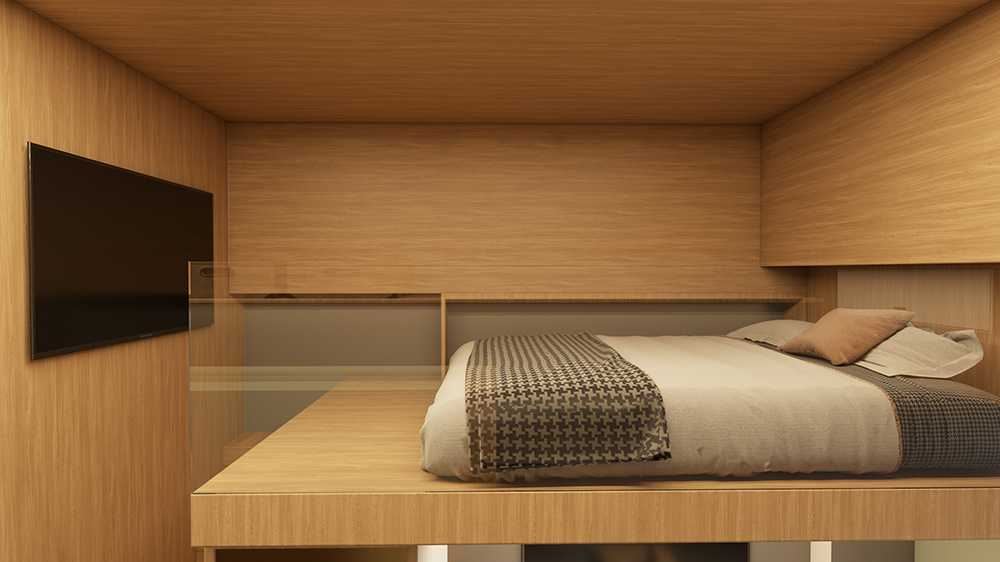 Com um pé direito de 4 metros foi possível criar um mezanino para o Studio, um exemplo brilhante de aproveitamento eficiente do espaço vertical. Elevado e privativo, este espaço foi projetado para ser um refúgio tranquilo dentro do estúdio. A cama de casal, posicionada de forma estratégica, permitiu a inserção de uma televisão, na qual utiliza o espaço disponível de maneira otimizada, garantindo conforto e praticidade. Um guarda corpo em vidro cria uma permeabilidade visual de quem está ali para a parte inferior do studio. Os acabamentos em mdf Jequitibá da Arauco, não só adicionam um toque de calor e acolhimento, mas também uma sofisticação que complementa o design geral do estúdio.