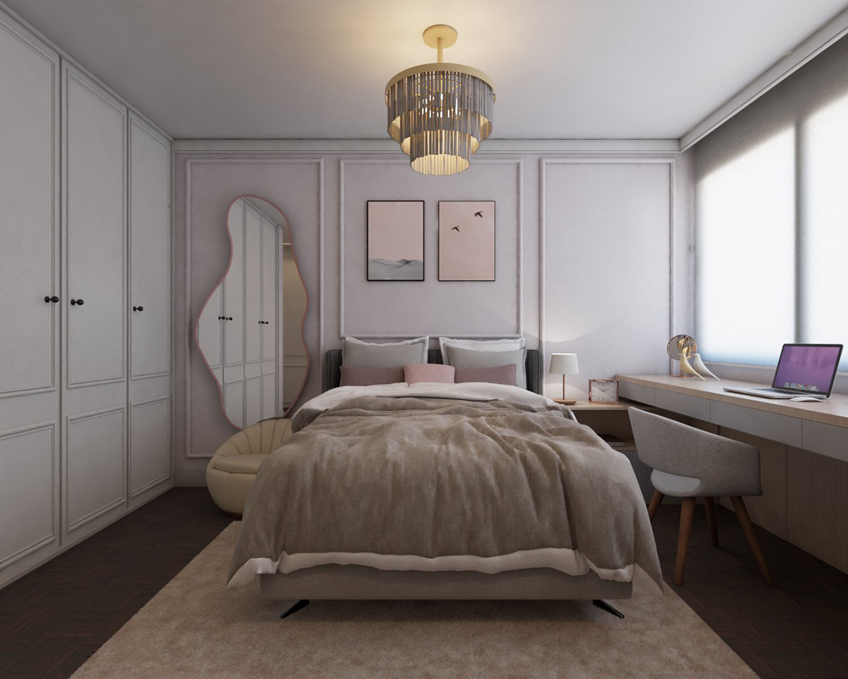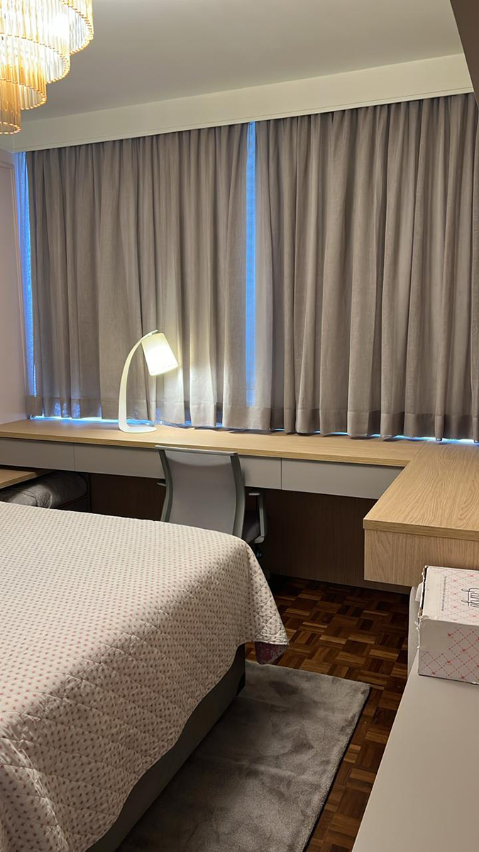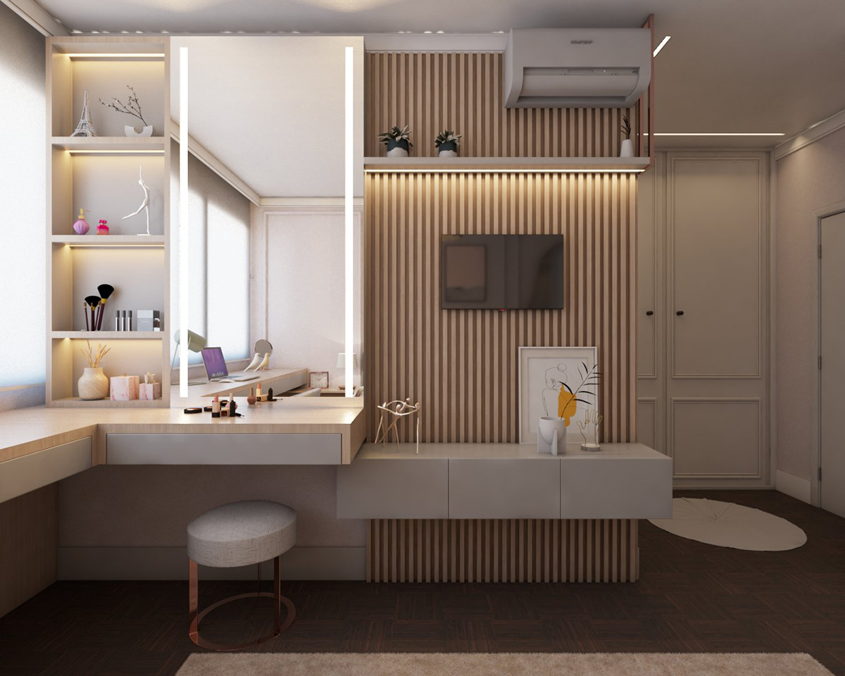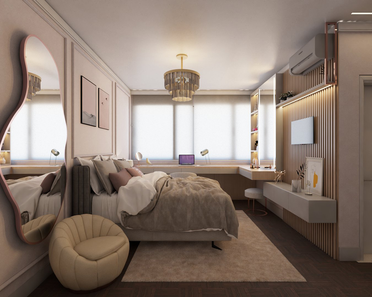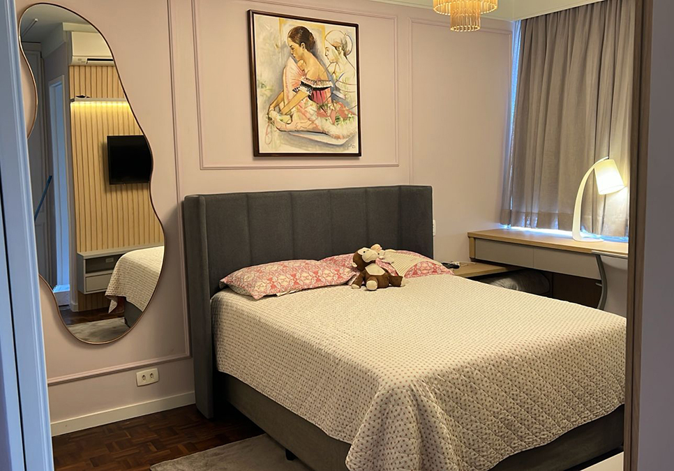 Com base na psicoarquitetura, incorporamos formas orgânicas — como o espelho de corpo inteiro com moldura ondulada — para estimular sensações de leveza e bem-estar. O destaque vai para a penteadeira funcional, o espelho e a cama de casal existente, que foram cuidadosamente integrados ao novo layout. Além do projeto, também realizamos o gerenciamento e acompanhamento de toda a obra, que foi executada com fidelidade às nossas orientações.